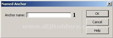 İlk olarak common araç çubuğundaki ‘Named Anchor’ simgesine tıklıyoruz tıkladıktan sonra aşağıdaki pencerede olduğu gibi oluşturacağımız durağın ismini gireriz: